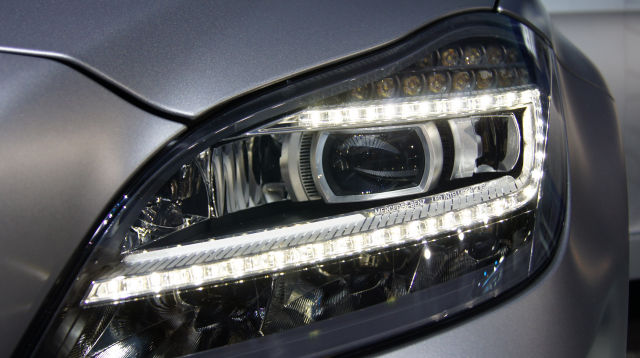 Au-dessus, une Audi A6 sans phares xénon allumés ; ci-dessous, la même avec feux de jour à LED allumés.