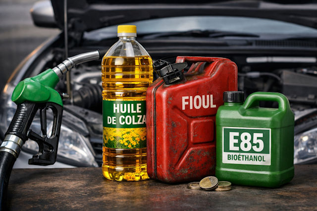 Commençons par une vérité, quand le carburant flambe, il n'y a pas cinquante miracles. Soit on consomme moins, soit on essaie de mettre dans le réservoir quelque chose qui coûte moins cher que le carburant prévu à l'origine. C'est précisément ce deuxième cas qui nous intéresse ici, et il faut donc accepter d'entrer sur un terrain moins propre, moins consensuel, parfois illégal, et souvent caricaturé par des gens qui n'ont jamais regardé une fiche technique de leur vie. Je vais donc dire les choses simplement, avec un peu de science et un peu de bon sens, car un moteur n'est ni une divinité fragile ni une poubelle universelle… c'est une machine qui tolère certaines dérives, mais pas toutes. Les prix cités plus bas sont des ordres de grandeur relevés en France autour du 8 et 9 avril 2026, avec un gazole autour de 2,37 €/L, le SP95-E10 autour de 2,02 €/L, l'E85 autour de 0,82 €/L, le fioul domestique autour de 1,86 à 1,91 €/L selon les relevés, et l'huile de colza premier prix autour de 1,46 à 1,95 €/L selon les enseignes.