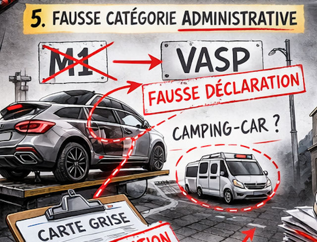 Certains tentent de faire classer le véhicule dans une catégorie administrative différente (VASP, véhicule spécialisé, etc.) sans transformation réelle ou sans cohérence technique.