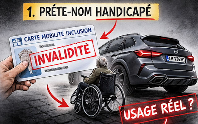 La fraude consiste à immatriculer le véhicule au nom d'un parent ou d'un proche handicapé alors que le véhicule est utilisé exclusivement par quelqu'un d'autre.