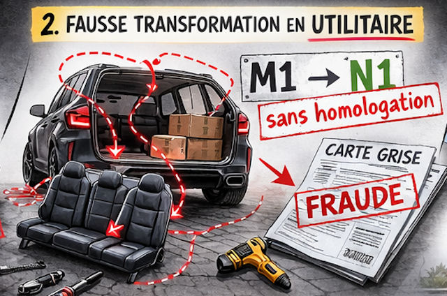 La fraude consiste à faire croire à une transformation réelle alors que le véhicule conserve en pratique son usage de voiture particulière.