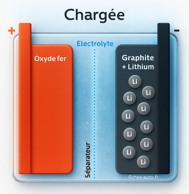 Lorsqu’une batterie est chargée, la majorité des ions lithium est logée dans le graphite de l’anode. La cathode, elle, est relativement pauvre en lithium. Ce déséquilibre entre les deux électrodes crée une différence de potentiel chimique, que l’on mesure sous forme de tension électrique.