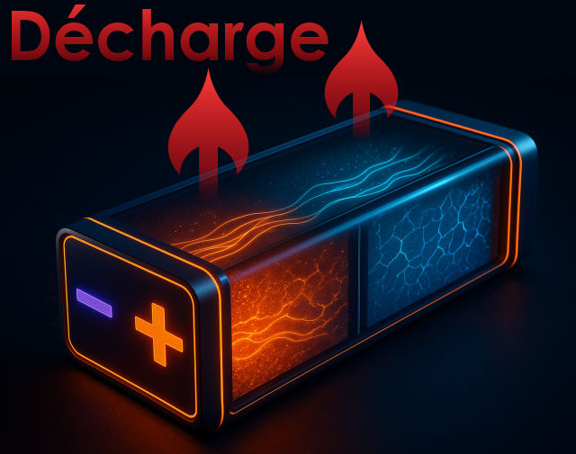 Ce processus est spontané. La décharge ne demande aucune énergie externe, car elle va dans le sens de la stabilité chimique. Les ions lithium “descendent la pente” énergétique : ils quittent un milieu où leur potentiel est élevé pour aller vers un milieu plus stable. C’est une réaction exothermique, qui libère un peu de chaleur.