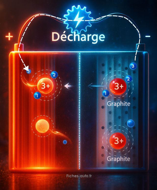 Lors de la décharge, une batterie lithium-ion transforme son énergie chimique en électricité. Les ions lithium migrent naturellement de l’anode vers la cathode, pendant que les électrons parcourent le circuit du véhicule. Ce mouvement coordonné, stable et spontané, se poursuit jusqu’à ce que la tension s’équilibre.
