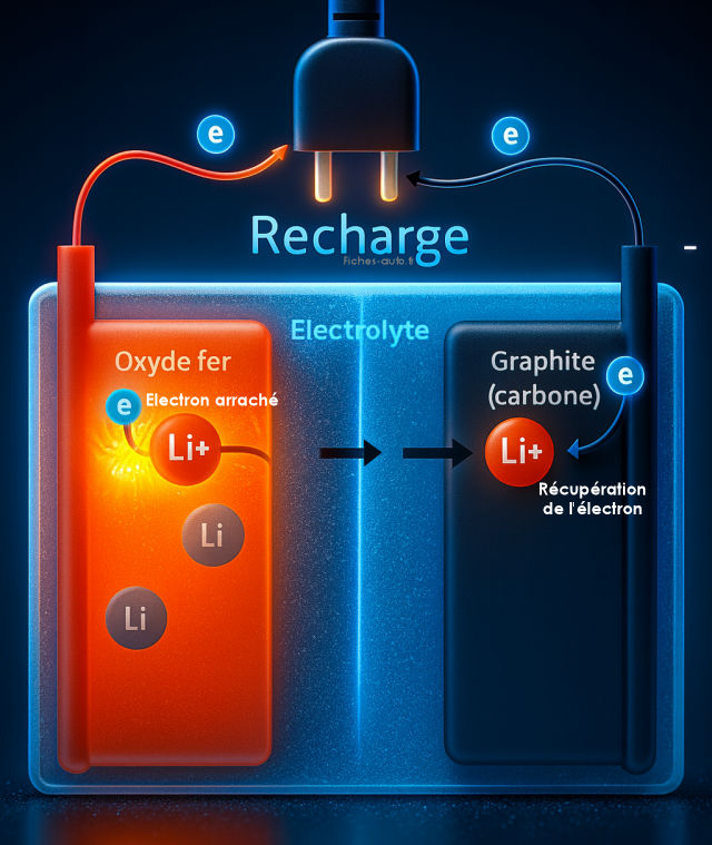 Lorsqu’on branche la batterie, la tension du chargeur force le flux à s’inverser. Les électrons sont renvoyés vers l’anode, et les ions lithium suivent en traversant à nouveau l’électrolyte, cette fois dans le sens inverse. Ils viennent se réinsérer entre les couches de graphite, rétablissant le déséquilibre chimique qui caractérise une batterie pleine.