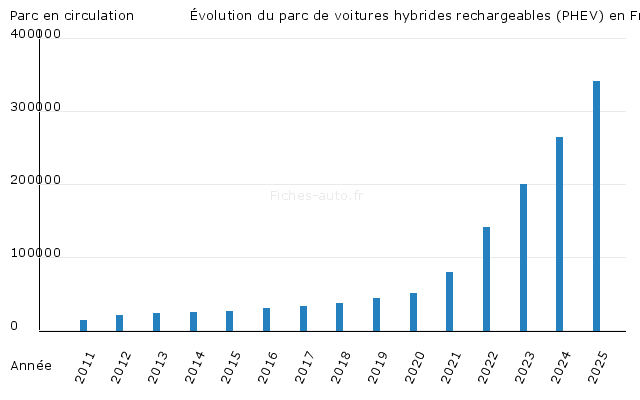 La courbe des hybrides rechargeables raconte une histoire très différente. Leur progression est réelle, avec un parc qui atteint environ 340 000 véhicules en 2025, mais elle reste beaucoup plus contenue en volume. À cette date, les PHEV représentent à peine 0,9 % du parc total des voitures particulières.
