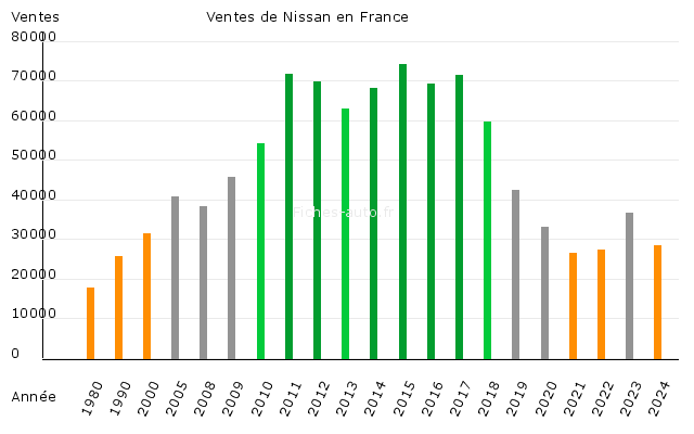 Le graphique illustre une progression marquée des ventes de Nissan en France à partir des années 2000, atteignant un pic entre 2012 et 2016, avec plus de 70 000 unités annuelles. Depuis, les chiffres sont en forte baisse, chutant à environ 20 000 unités en 2023 et 2024. Ce recul traduit une perte d'attractivité des modèles de la marque, malgré une image solide construite dans le passé.