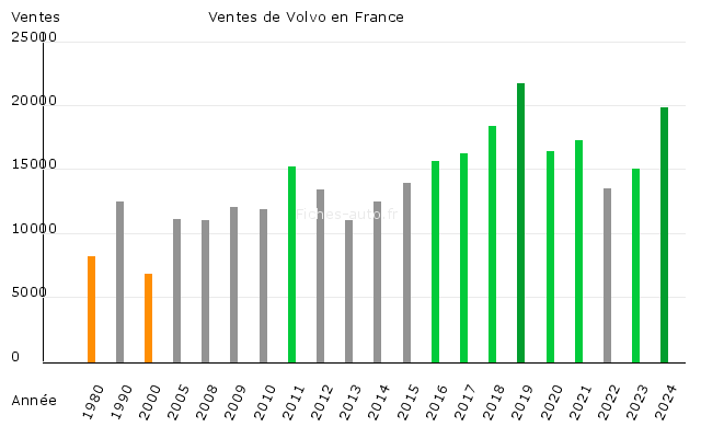 Volvo, marque suédoise emblématique, a longtemps été associée à des valeurs de sécurité et de robustesse. Ces dernières années, elle a su renouveler son image et élargir sa clientèle grâce à des modèles attractifs et une transition progressive vers l'électrification. Ce graphique met en lumière la progression des ventes de Volvo en France, marquant une ascension remarquable ces dernières années.