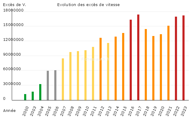 Quelle est l'évolution du nombre d'excès de vitesse en France ? Ou plutôt, pour être plus réaliste, quelle est l'évolution du nombre de contraventions liées aux excès de vitesse. En effet, ces chiffres ne nous permettent pas totalement d'estimer si les Français sont de plus en plus coutumiers des excès de vitesse, car ces derniers dépendent directement de l'efficacité et de l'activité des autorités au bord de nos routes. Et on peut dire que l'automatisation des dispositifs a favorisé l'explosion des chiffres ...
