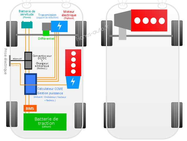 carburant → moteur thermique → générateur → électronique de conversion → batterie → électronique de conversion → moteur électrique → roues.