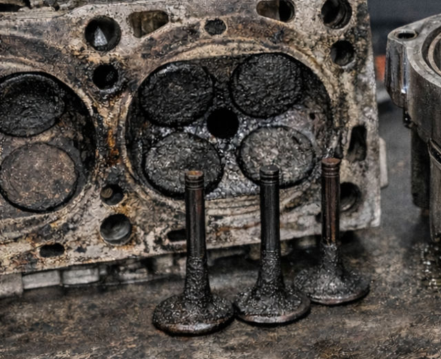 Lorsque le moteur a consommé de l'huile, l'encrassement des soupapes peut devenir sévère (d'autant plus sur les moteurs à injection directe). La calamine accumulée crée des points chauds, perturbe la combustion et peut aller jusqu'à provoquer la casse d'une soupape.