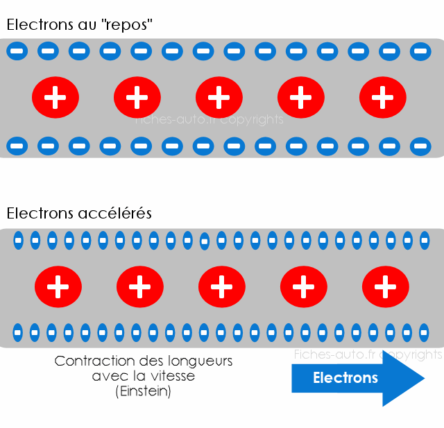 Quand les électrons se déplacent, leur champ électrique se déforme (relativité restreinte) et fait apparaître un champ magnétique bipolaire (malgré que l'éle