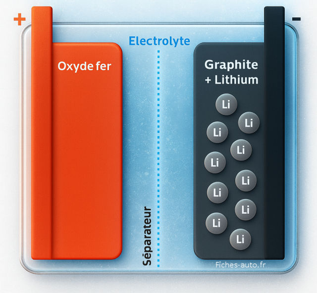 Cette fois-ci ce sont donc les ions lithiums (+ / cations) qui sont attirés vers la cathode (+) dans laquelle se situe l'oxyde de fer (c'est de là où ils venaient avant de recharger la batterie). Ils sont toutefois bloqués par le fait qu'il y a des électrons (-) dans l'anode qui les retient. Les ions lithium sont chargés positivement (+) et les électrons négativement (-), ces derniers retiennent donc le lithium du côté (-) par attraction (le + attire le -).