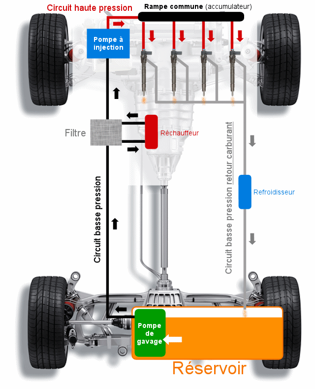 Le schéma est volontairement simplifié pour mettre en évidence les canaux principaux. Le retour de carburant depuis la pompe à injection vers le réservoir, ou le canister (réservoir de vapeurs dédié à leur filtration et à leur réinjection dans l’admission), n’ont pas été détaillés ici.
