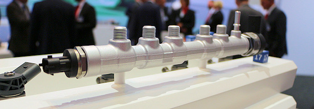 La pompe haute pression (en bleu sur le schéma) prend ensuite le relais. Son rôle est de porter la pression à des valeurs bien plus élevées : jusqu’à 2000 bars sur les diesels modernes et environ 150 bars sur les moteurs à essence à injection directe. Cette pompe alimente la rampe commune (ou common rail), un collecteur qui stabilise la pression et alimente les injecteurs.