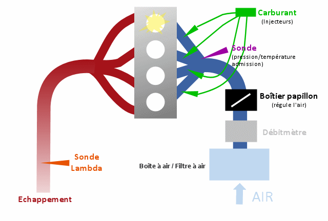 Le calculateur du moteur permet de doser tous les "ingrédients" de manière juste grâce aux informations que lui apportent les différents capteurs / sondes. Le débitmètre indique la masse d'air entrante et sa température. Le capteur de pression dans la tubulure d'admission permet de connaître la pression de la suralimentation (turbo) en modulant cette dernière grâce au wastegate. La sonde lambda dans l'échappement permet de voir ce qu'a donné le résultat du mélange en étudiant la contenance des gaz d'échappement.