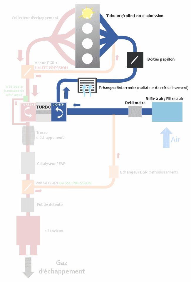 Pour provoquer la combustion dans un moteur thermique il faut deux éléments clés : le carburant et le comburant. Nous allons nous attacher ici à observer la manière dont arrive le comburant dans le moteur, à savoir l'oxygène présent dans l'air.