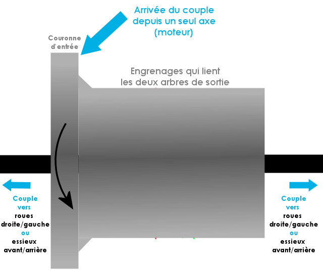 Un différentiel classique permet de répartir du deux essieux une puissance provenant d'une seule source : en l'occurrence la puissance du moteur est répartie sur deux roues. Il permet, en plus de répartir la puissance sur deux axes et que le couple puisse être différent sur chaque axe. Par exemple, avec un différentiel standard, si j'ai une des roues dans le vide (qui ne subit donc aucune résistance), tout le couple sera envoyée sur l'autre. Ce type de différentiel est basique et réagit donc de manière "primaire". Dans mon exemple, on aura donc une voiture qui voit sa roue dans le vide tourner pendant que l'autre ne bouge pas ... L'auto reste donc sur place et ne peut pas avancer.