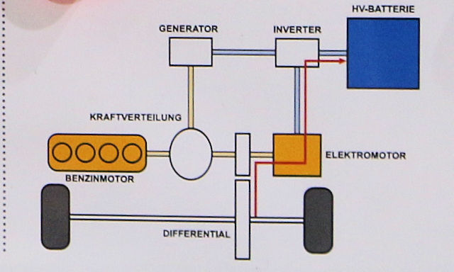 Le dispositif est appelé série / parallèle car il est nommé "série" quand on est en mode 100% électrique. On a donc un fonctionnement semblable à une BMW i3, le moteur thermique est un générateur de courant qui alimente une batterie qui elle-même va faire mouvoir l'auto. En gros, avec cette manière de faire le moteur est totalement déconnecté des roues.