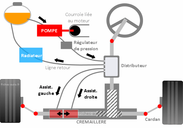 Ici on va utiliser la force du moteur (en le connectant avec une courroie et une poulie) pour activer une pompe et un distributeur hydraulique pour envoyer l'assistance vers la gauche ou vers la droite, selon la direction qu'on prend avec le volant (quand je tourne à gauche il ne faut pas que la pression hydraulique pousse vers la droite ...).