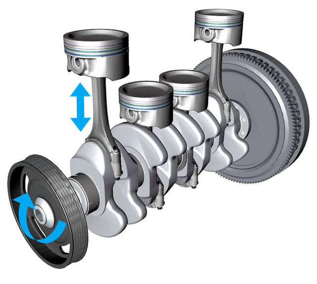 Le vilebrequin convertit le mouvement de va-et-vient des pistons en un mouvement rotatif en étant relié aux pistons via des bielles. Lorsque les pistons se déplacent dans les cylindres suite à la combustion (= dilatation des gaz) du mélange air-carburant, la force linéaire est transmise au vilebrequin, qui la transforme en rotation. Ce mouvement rotatif est ensuite transmis aux roues via la transmission, permettant le déplacement du véhicule. Le vilebrequin doit supporter des forces très élevées à chaque explosion dans les cylindres, tout en assurant une rotation régulière et stable.