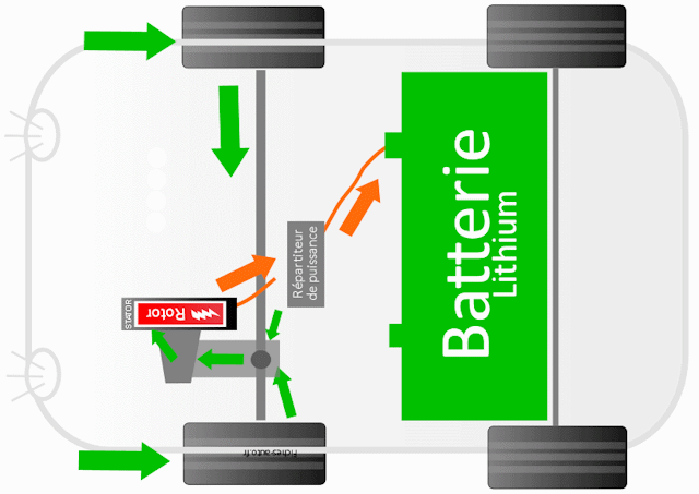 Lors du freinage régénératif, la fréquence d'alimentation du stator est réduite (vitesse inférieure à la rotation des roues, et donc du rotor) pour que l'onde de flux se déplace plus lentement que le rotor (l'inverse du moteur moteur, qui a un glissement de ce genre : vitesse de l'électricité dans le stator supérieure à la vitesse de rotation du rotor). Ce glissement négatif cause une inversion des forces sur le rotor et le stator, ce qui fait tourner le moteur en mode génération. Le moteur alimente alors la batterie pour la recharger, laquelle provient de la force électromotrice (EMF) qui pousse les électrons autour du circuit du rotor.