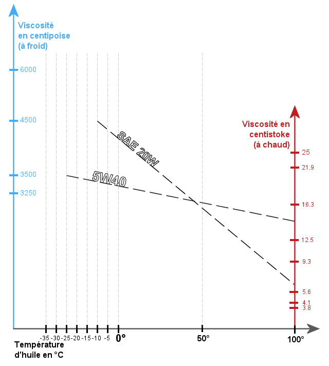 La SAE (Society of Automotive Engineers) a mis au point des indices fixes de viscosité (5W30, 20W, 40, etc.). Les fournisseurs d'huile doivent donc proposer des huiles dont les viscosités sont compatibles avec des normes. Notez donc bien que cet indice est le résultat d'une viscosité par rapport à une température. Pour les indices à chaud il s'agit de la viscosité mesurée en centistokes à 100° alors qu'à froid la température à laquelle est mesurée la viscosité est de -18°. De plus, comme je l'ai déjà dit précédemment, la mesure de la viscosité à froid n'utilise pas la même unité de mesure : le centipoise contre le centistoke à chaud.