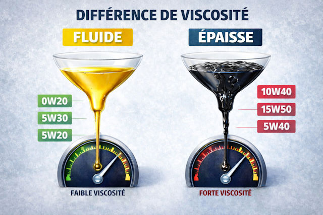 Ce n'est pas juste une nuance. On passe d'une huile très fluide, pensée pour des moteurs modernes optimisés, à une huile nettement plus épaisse, adaptée à des contraintes différentes.