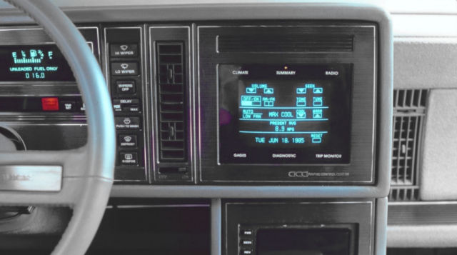 Mais l'innovation la plus radicale de la décennie reste l'arrivée de l'écran central de commande. En 1986, la Buick Riviera introduit le Graphic Control Center. Il s'agit d'un écran cathodique monochrome d'environ 9 pouces, recouvert d'une surface tactile. Ce n'est pas un simple affichage, l'écran pilote réellement des fonctions. Climatisation, autoradio, informations de trajet, rappels d'entretien. Tout passe par lui. tesla n'a qu'à bien se tenir !