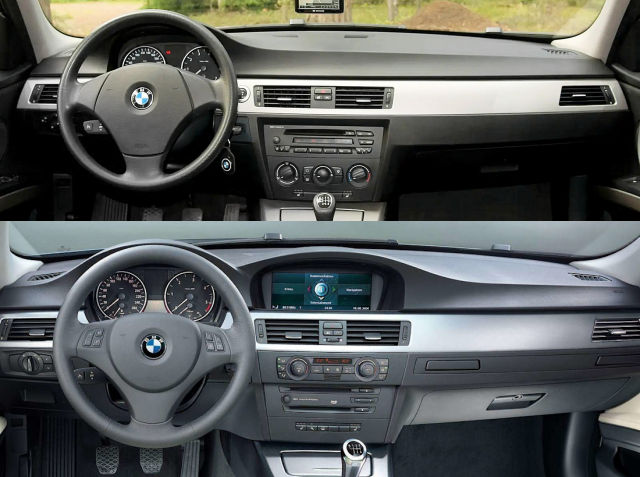 C'est aussi la période où apparaissent les grandes interfaces propriétaires, chacune avec sa philosophie, souvent très différente. Chez BMW, l'arrivée de l'iDrive marque une rupture nette. Introduit au début des années 2000 sur la Série 7 E65, puis décliné progressivement sur d'autres modèles, il repose sur une molette centrale permettant de naviguer dans des menus hiérarchisés. Sur la BMW Série 3 E90, cette interface transforme complètement la planche de bord. Deux versions coexistent. Sans écran, l'habitacle reste classique, avec des commandes physiques réparties de manière intuitive. Avec écran, l'iDrive centralise la navigation, les réglages du véhicule, l'audio, parfois le téléphone. La console change, la lecture de l'habitacle aussi. Avec le recul, beaucoup estiment que les versions sans écran ont mieux vieilli, car le premier iDrive souffre de graphismes datés, de menus trop profonds et d'une ergonomie encore mal digérée par les utilisateurs.