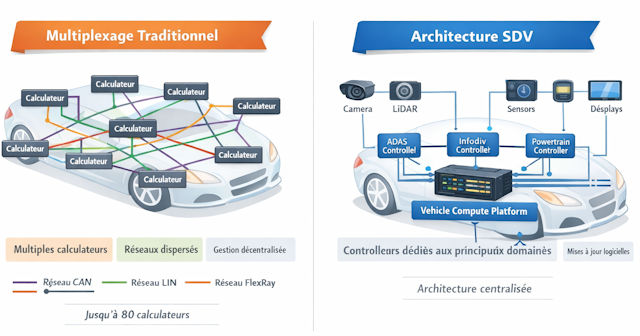 On pensait avoir atteint un sommet avec le multiplexage. Des dizaines de calculateurs reliés entre eux, capables de dialoguer via le bus CAN, c’était déjà une petite révolution. Et pourtant, avec le SDV, on change d’échelle : ce n’est plus une évolution, c’est un basculement vers une centralisation maximale mais logique.