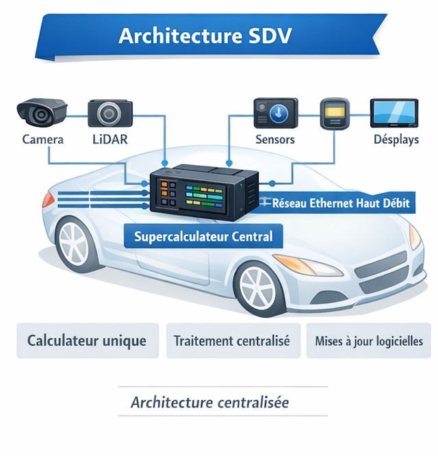 Avec le SDV, on ne cherche plus à améliorer ce modèle, on le remplace. La logique bascule complètement, puisque ce n’est plus le matériel qui dicte les fonctions, mais le logiciel qui prend la main. Au lieu d’avoir une multitude de calculateurs spécialisés, on regroupe les rôles autour de quelques unités de calcul beaucoup plus puissantes, capables de gérer plusieurs fonctions en parallèle. On passe ainsi d’une architecture distribuée à une organisation bien plus centralisée, où un même système peut piloter à la fois les aides à la conduite, la gestion de l’énergie ou encore l’infodivertissement. La voiture devient alors un ensemble cohérent, pensé comme un système informatique global plutôt qu’un assemblage de modules indépendants. Cette approche change profondément la manière de concevoir un véhicule, mais aussi la façon dont il évolue au fil du temps.
