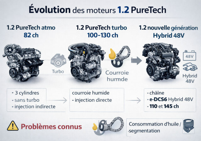 Le 1.2 PureTech est devenu l'un des moteurs les plus diffusés du groupe PSA puis Stellantis. Sous cette appellation se cache une famille de blocs 3 cylindres essence qui a connu plusieurs évolutions : version atmosphérique, versions turbo à courroie humide, puis génération récente à chaîne de distribution associée à l'hybridation légère 48V.