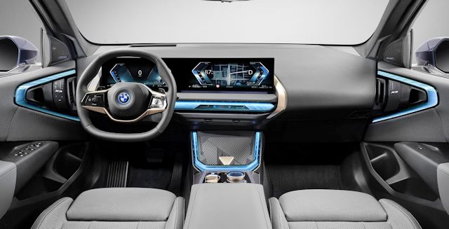 Il dispose d'un système d'infodivertissement désormais bien connu chez BM avec une double dalle incurvée (mais aux coins carrés peu harmonieux) intégrant un combiné numérique de 12,3 pouces et un écran central tactile de 14,9 pouces (hélas très étiré en longueur, réduisant sa polyvalence). Le système BMW OS 9 est doté d'une connectivité 5G, Android Auto et Apple CarPlay. La console centrale dispose d'un chargeur à induction et les commandes de climatisation passent par l'écran tactile, tandis qu'une molette dédiée contrôle le volume audio.