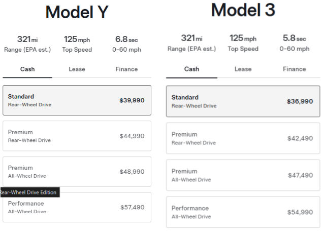 La 3 se vend désormais à partir de 36 990$ et le Y à 39 990$, des tarifs qui sont très concurrentiels mais qui ne permettent pas de mettre un hypercute à la concurrence. Mais peut-être que Tesla en garde sous le coude, avec une baisse potentielle à venir qui finira d'étouffer les marques occidentales concurrentes, laissant alors sur le ring Tesla et les Chinois uniquement.