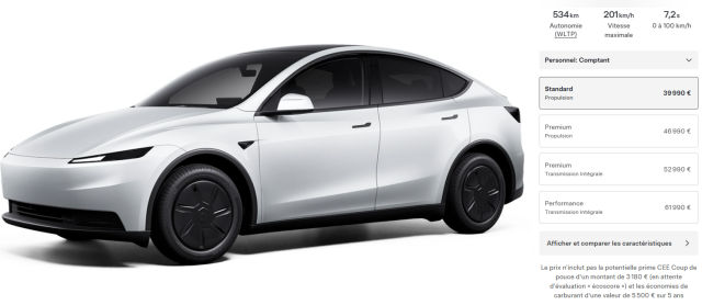 Tesla crée la surprise. Deux jours seulement après son lancement aux États-Unis, le Model Y Standard fait déjà son apparition sur le configurateur français. Peu s’y attendaient, d’autant que tout laissait penser que cette déclinaison resterait réservée au marché américain. Il est pourtant bien là, et à un tarif qui rebat complètement les cartes : 39 990 euros.