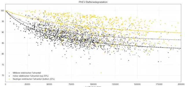 L'ADAC a aussi classé les conducteurs selon leur taux d'usage du mode électrique. Résultat logique : plus le mode électrique est utilisé, plus la batterie vieillit vite, car elle subit davantage de cycles de charge et décharge.