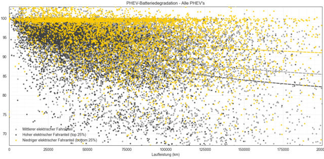 Tous les modèles : les cellules de batterie rarement sollicitées (points jaunes) se concentrent dans la partie supérieure, là où la capacité de la batterie reste bonne. La forte dispersion des points montre que, outre l'usage, des facteurs comme le constructeur, le modèle, le type de batterie, les défauts de cellules et la température influencent la durée de vie de la batterie.