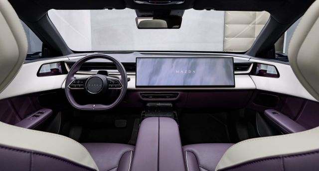 L'intérieur est technologiquement ambitieux, mais il y a une décision qui passe mal : Mazda a choisi de supprimer tout écran de combiné derrière le volant sur la CX-6e. À la place, on mise sur un affichage tête haute très grand.