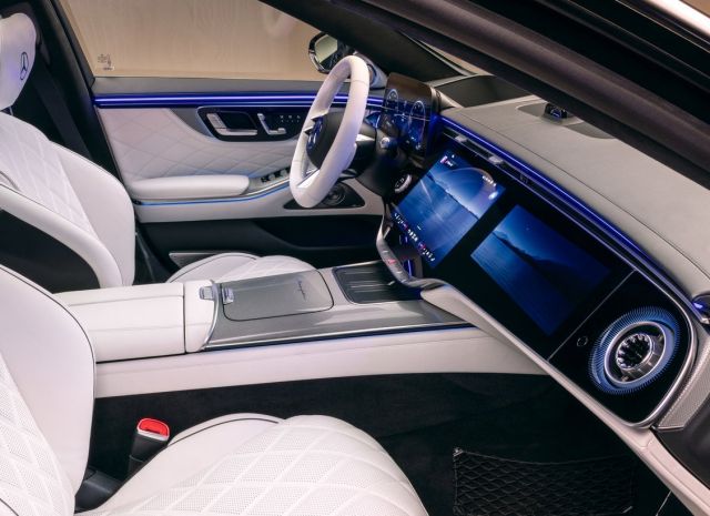 À bord, le constat est encore plus évident. Le MBUX Superscreen devient la norme, avec trois écrans alignés, une interface MB.OS enrichie d’intelligence artificielle générative, un assistant vocal plus bavard, plus contextuel, plus mémoriel. C’est impressionnant sur le plan technologique, mais l’effet statutaire s’est érodé puisque cette planche de bord vient reprendre la même architecture que la Classe E : même philosophie, même mise en scène, même surenchère numérique. Le retour de commandes physiques sur le volant est bienvenu, mais il ressemble davantage à une correction qu’à une vision. La navigation Google Maps en 3D fonctionne parfaitement, le système audio Burmester 4D avec vibrations intégrées aux sièges impressionne, mais tout cela relève davantage de la démonstration que de la distinction.