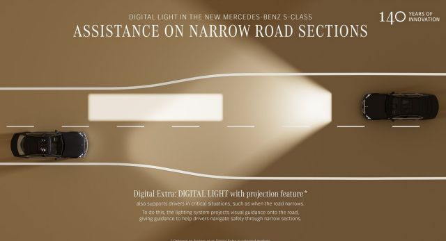 Avec Digital Light, la Classe S utilise ses projecteurs comme un véritable outil de guidage lorsque la route se resserre. Dans les zones étroites, mal délimitées ou temporairement contraintes, le faisceau lumineux adapte sa forme et peut projeter des repères visuels directement sur la chaussée afin d’indiquer la trajectoire optimale. L’objectif n’est pas d’éclairer plus fort, mais d’éclairer plus intelligemment, en aidant le conducteur à positionner la voiture avec précision dans l’espace disponible. Techniquement, le système exploite la très haute définition des modules Digital Light pour sculpter le faisceau en temps réel. Dans l’esprit, on franchit un cap : l’éclairage ne se contente plus de révéler la route, il commence à la commenter. Utile dans certaines situations, certes, mais révélateur d’une approche où la technologie devient de plus en plus visible, presque pédagogique, là où une Classe S s’est longtemps distinguée par sa capacité à tout faire sans jamais se faire remarquer.