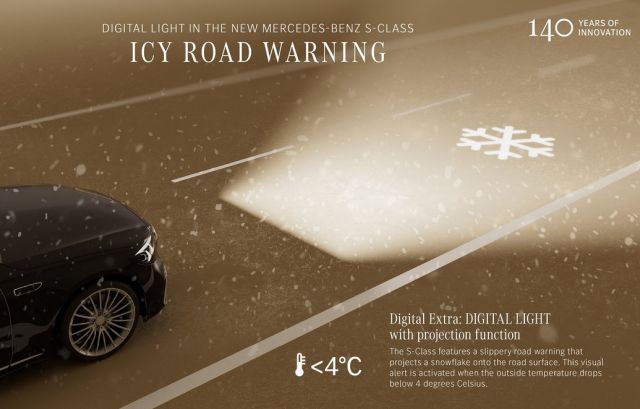 Avec le système Digital Light, la Classe S va plus loin que l’éclairage adaptatif classique en utilisant la route elle-même comme support d’information. Lorsque la température extérieure descend sous les 4 °C et que les conditions deviennent propices au verglas, les projecteurs peuvent afficher un pictogramme de flocon directement sur la chaussée. L’idée est de matérialiser le danger là où il se trouve, plutôt que de se contenter d’un voyant abstrait au tableau de bord. Techniquement, la prouesse est réelle, rendue possible par la haute résolution des modules Digital Light. Conceptuellement, le dispositif interroge. À ce niveau de gamme, on attend une aide discrète, presque invisible, pas forcément un symbole projeté au sol comme un panneau temporaire. L’intention sécuritaire est louable, mais cette mise en scène lumineuse illustre bien la dérive actuelle : montrer que la voiture sait, plutôt que simplement agir sans se faire remarquer.