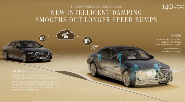 Mercedes met en avant un amortissement dit intelligent, capable d’anticiper les ralentisseurs longs avant même que la voiture ne les atteigne. Le principe repose sur une lecture de la route combinée à des données partagées via le cloud : lorsqu’un autre véhicule Mercedes détecte un dos-d’âne allongé, l’information est transmise afin que la suspension adapte sa loi d’amortissement en amont. Concrètement, la suspension se prépare, se détend ou se raffermit avant l’impact, ce qui limite fortement les mouvements de caisse et les secousses sèches, en particulier à l’arrière. Mercedes annonce une réduction de moitié des mouvements désagréables du corps, ce qui en dit long sur la cible réelle de cette technologie : le passager arrière, pas le conducteur. On ne parle pas ici de sport ou de précision de conduite, mais d’un confort prédictif, presque passif, où la voiture encaisse la route pour vous, sans même vous prévenir.