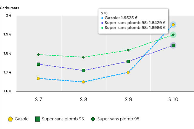 Le SP95, lui, passe sur la même période d'environ 1.75 € à 1.84 €. La hausse est réelle, mais elle reste plus progressive. Même constat pour le SP98 qui évolue d'environ 1.81 € à 1.89 €. Là encore, l'augmentation est visible mais reste bien moins brutale que celle du gazole.
