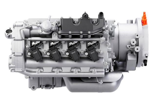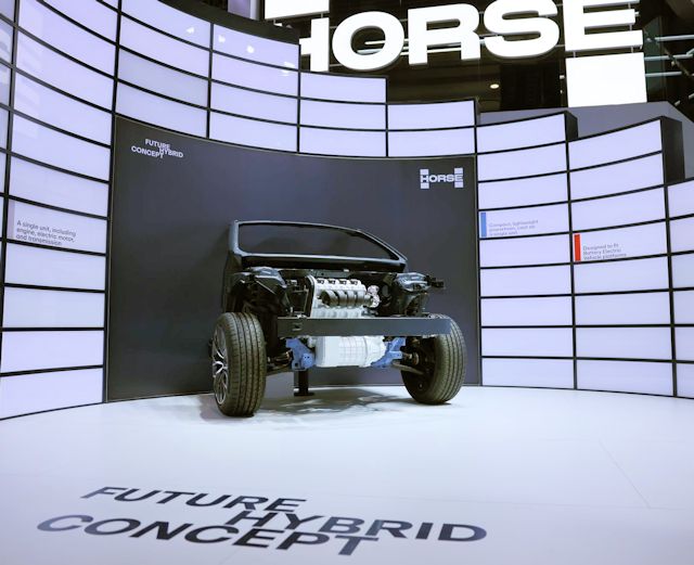 À côté du Future Hybrid System, Horse présente aussi le C15, qui semble finalement plus logique. Il s'agit d'un prolongateur d'autonomie très compact qui réunit un quatre cylindres 1.5 litre, un générateur et un onduleur dans un volume de seulement 500 x 550 x 275 mm. La version atmosphérique développe 70 kW, soit environ 95 ch, tandis que la version turbo atteint 120 kW, soit environ 163 ch. Le taux de compression passe de 14,5:1 sur l'atmo à 11:1 sur le turbo, ce qui est assez logique vu les contraintes de suralimentation. Ce moteur à injection directe peut fonctionner à l'essence, mais aussi avec certains carburants alternatifs selon les configurations.