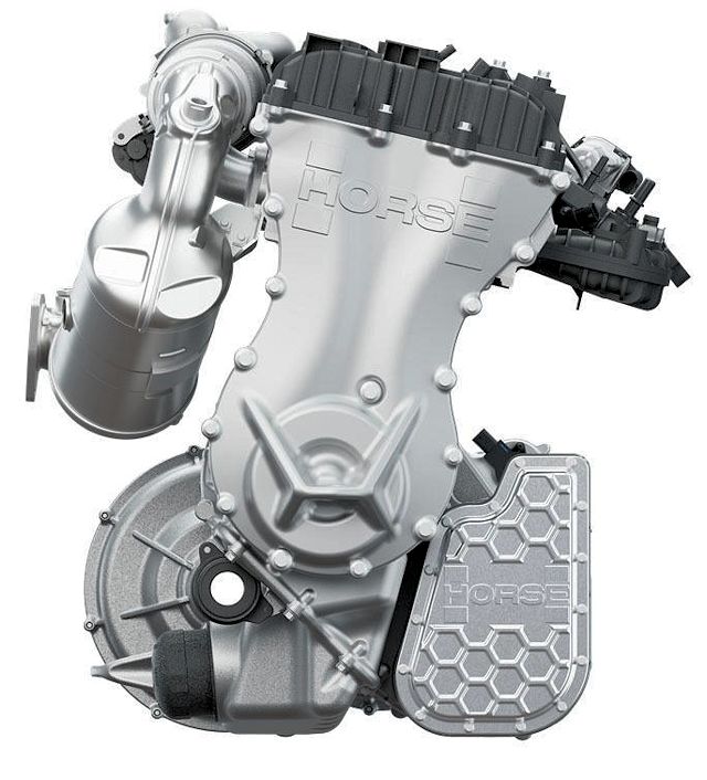 Le B15 est un quatre cylindres 1.5 litre turbo essence conçu pour fonctionner avec une chaîne hybride complète, notamment avec la 3DHT160. Il développe 120 kW, soit environ 163 ch, pour 255 Nm de couple, avec un rendement thermique annoncé à 41,7 %. C'est une valeur correcte et même élevée pour un essence, mais il ne faut pas non plus en faire une prouesse qui sauverait le thermique. Un moteur qui transforme encore plus de la moitié de l'énergie du carburant en chaleur reste, par nature, une machine très perfectible. Horse utilise donc l'électrification pour le rendre moins mauvais dans ses phases critiques, avec allumage haute énergie, pompe à eau électrique, turbocompresseur assisté électriquement et gestion en temps réel.