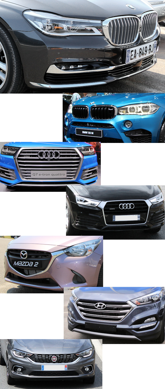 Depuis que la Série 3 F30 est sortie, de plus en plus d'autos prennent le parti de coller les optiques à la calandre (calandre qui doit avoir un aspect métallique). Exemple ici avec un X5 de 3ème génération, un Q3 restylé et un Q7. Et finalement c'est la 406 phase 2 qui aura un peu inauguré la chose !
