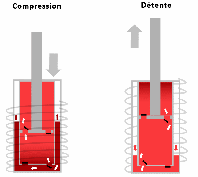 Le liquide (en rouge) ralentit le mouvement du piston, afin de limiter les oscillations excessives et incontrôlées de la suspension (ressort). Une valve est dédiée à la compression et une autre à la détente, permettant de réguler la vitesse de passage de l'huile différemment pour chaque phase. Le modèle mono-tube se distingue par de meilleures performances, grâce à une pression interne plus élevée et un refroidissement plus efficace de l'huile, qui tend à chauffer lorsqu'elle circule entre les réservoirs. Cela permet une conduite sportive plus prolongée. Contrairement au bi-tube, le mono-tube peut être monté à l'envers, est techniquement plus simple et généralement réglé plus fermement. Ce système est reconnu pour être plus efficace en conduite intensive.