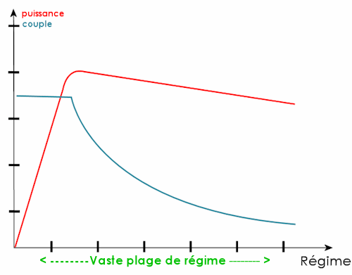 La plage de régime de la voiture électrique est immense, avec un régime qui débute dès 1 tour/minute (pas nécessaire d'avoir une rotation constante comme sur un thermique)