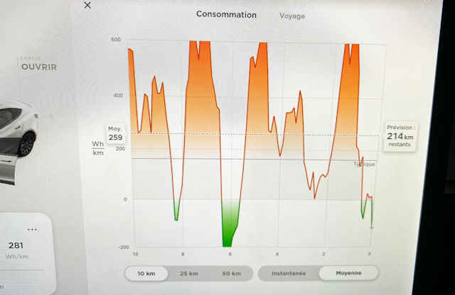 Voici deux extrêmes que j'ai un peu provoqué de manière intentionnelle. La consommation du haut est négative (j'ai réinitialisé le compteur en haut d'une longue descente) et celle du bas plutôt très lourde (en tirant sur la mécanique)
